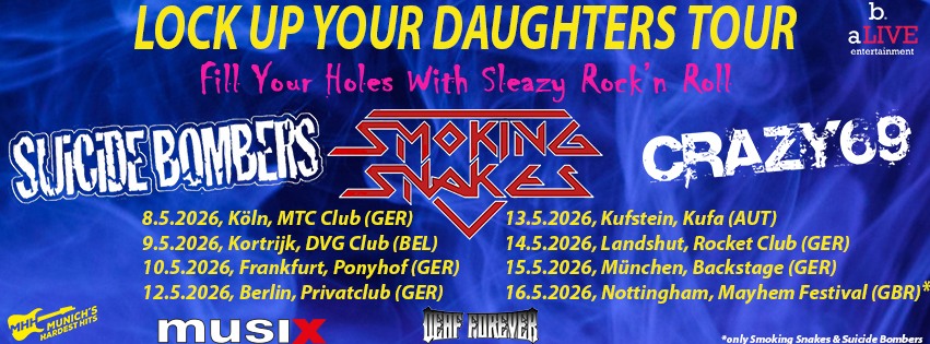 SMOKING SNAKES, Suicide Bombers & Crazy69 LIVE on Stage! Sperrt eure Töchter ein – der Sunset Strip kommt in die Stadt!